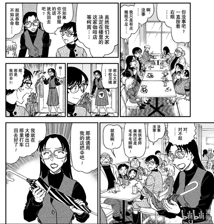 4. 时间回到当下,按着右眼回忆往事的若狭(浅香)正与小林和侦探团等待被黑田叫走的柯南。小林见若狭不舒服让她先回去,若狭取伞时弄坏了小林的伞,便将自己的伞留给小林,准备单独离开酒店;