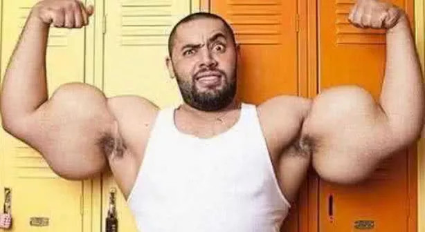 2、世界上最大的肱二头肌。健身教练穆斯塔法·伊斯梅尔从14岁起开始对手臂进行针对性锻炼,目前其肱二头肌大到惊人,近80厘米,堪比普通人的腰围。真是很搞笑,跟大力水手很像。