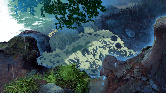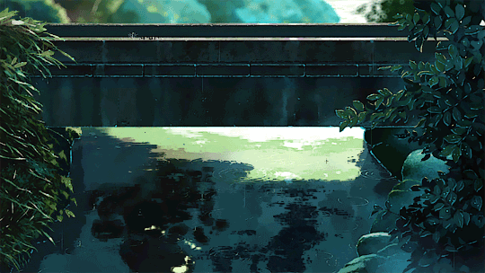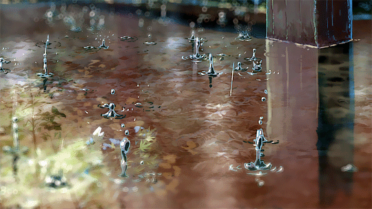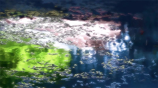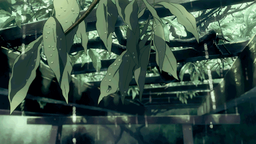 雨景,是新海诚最为拿手的。其中两个人坐在亭中避雨,看池塘里涟漪点点,甚至能够以假乱真的水滴从树叶上低落的场景,让观众叹为观止。