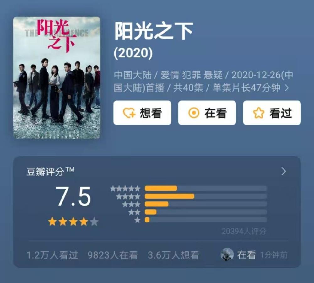 目前为止关于《阳光之下》的好评还是比较多的,因为尺度原因,不仅电视剧中的一些场景做了修改,就连主角的名字也改了,这让看过原著的粉丝难免有些出戏,但是挡不住彭冠英和蔡文静都演技在线,电视剧也比较还原原著小说,所以追剧的人不在少数,《阳光之下》现在评分7.6,比起最开始的7.9有所下滑,但电视剧刚开播没多久,后续会如何发展还要等之后的剧集播出再说。