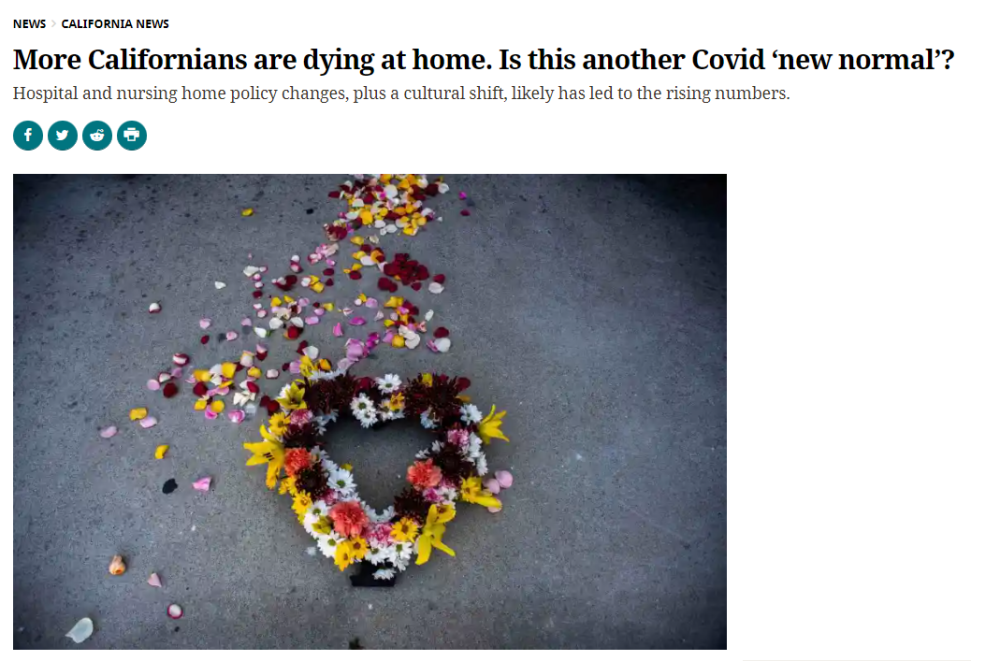 疫情期间在家死亡的人数比例攀升。在疫情期间,加州在家死亡的比例大幅上升,加速了数十年来的趋势。在2022年前10个月去世的加州人中,约有40%是在家里去世的。