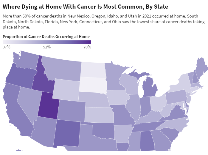 哪个州因癌症在家死亡最常见??2021年,在新墨西哥州、俄勒冈州、爱达荷州和犹他州,超过60%的癌症死亡发生在家里。南达科他州、北达科他州、佛罗里达州、纽约州、康涅狄格州和俄亥俄州的家庭癌症死亡比例最低。