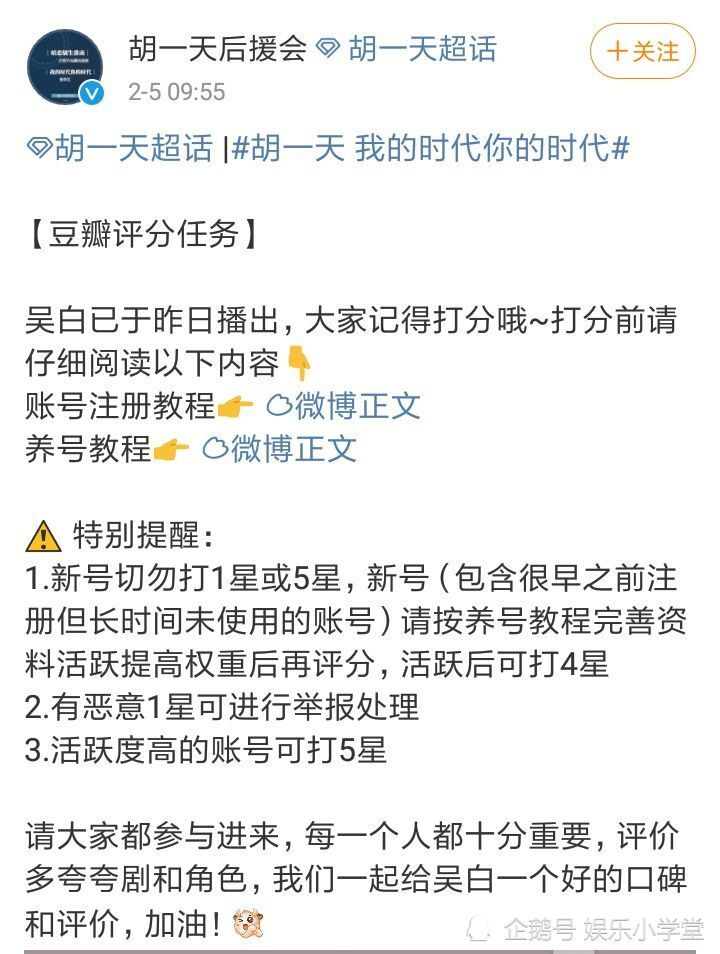 当然了,《我的时代,你的时代》这部剧获得了6.9分,这个成绩还是很不错的。但有网友发现,男主胡一天的粉丝后援会竟在微博上公然发声,让所有粉丝都去豆瓣参与评分,还附有详细的豆瓣账号注册教程以及养号教程。不得不说,粉丝这样的行为也是很败好感了。