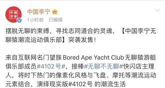 从2022年4月开始,从中国李宁、到绿地地产、等等,相继和风靡全球的NFT- IP新贵无聊猿合作,推出了一系列全新的IP合作方式。