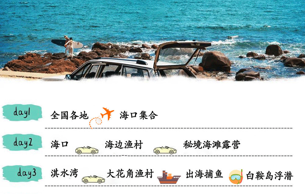 二.全程住宿费: (海口,三亚五星级酒店二晚,大花角渔村,后海渔村,西岛民宿三晚,露营一晚)