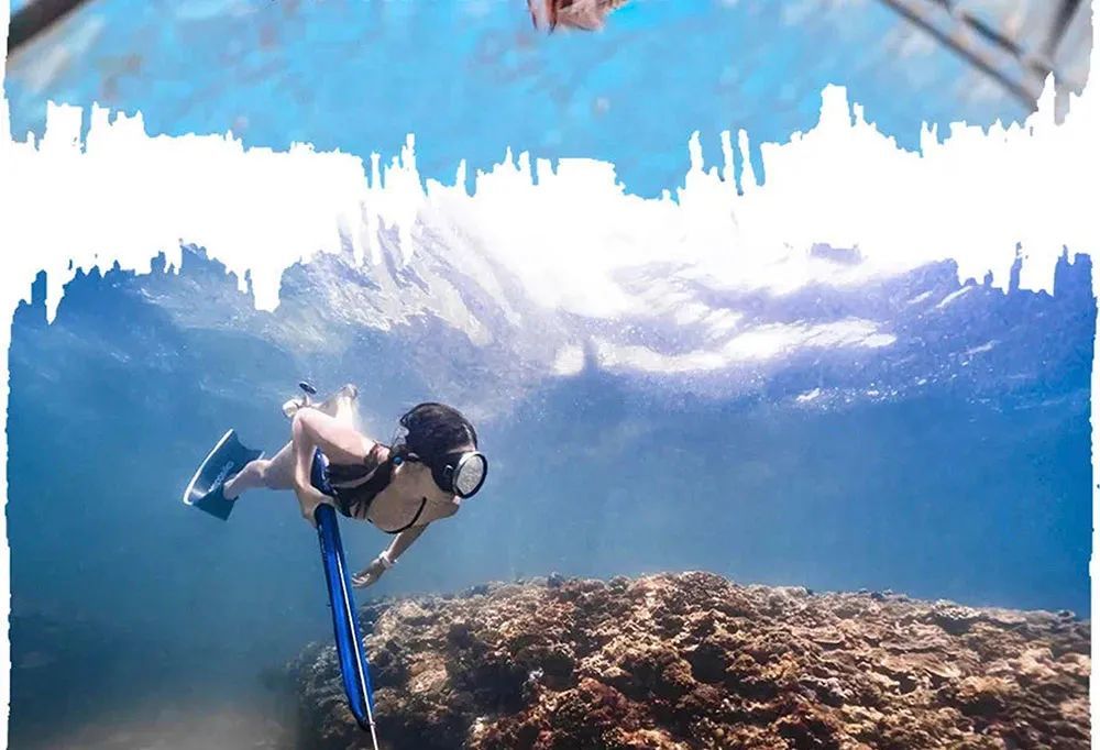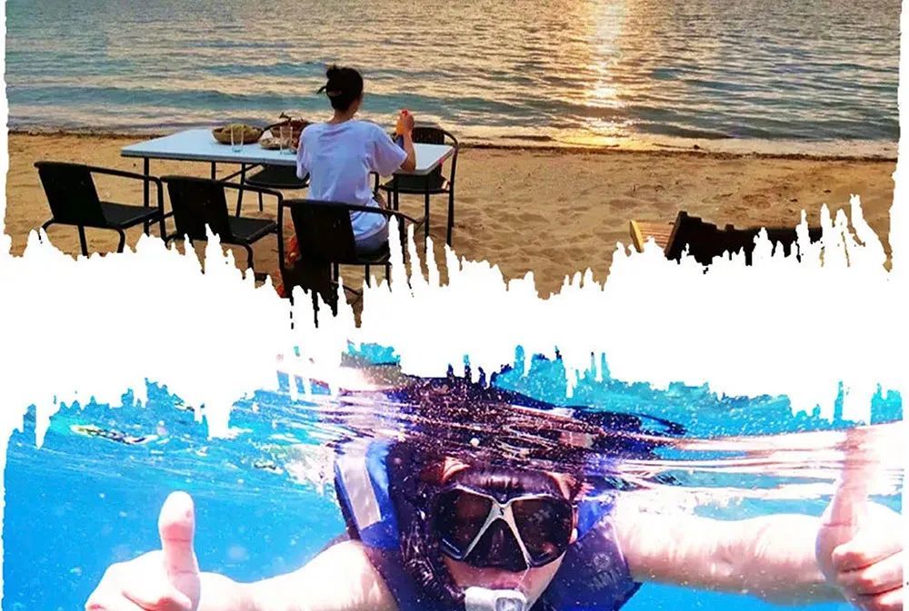 这里不仅有马代同款果冻蓝海水,能见度达到20米;潜入水下,你还可以看见美丽的珊瑚礁,和鱼群共舞。