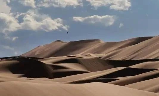 这里,金字塔形的沙丘屹立于平原以上300米。狂风能将沙墙吹起,高度可达其3倍。沙漠里沙丘绵延,受风的影响,沙丘时常移动。