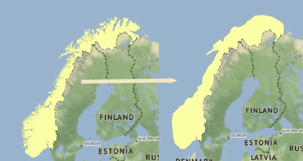 峡湾分布的地区,往往海岸线曲折而漫长,比如有“峡湾王国”之称的挪威,假设将峡湾部分拉直(如下图),海岸线长度会从现在估计的2.9万千米降到2500千米。