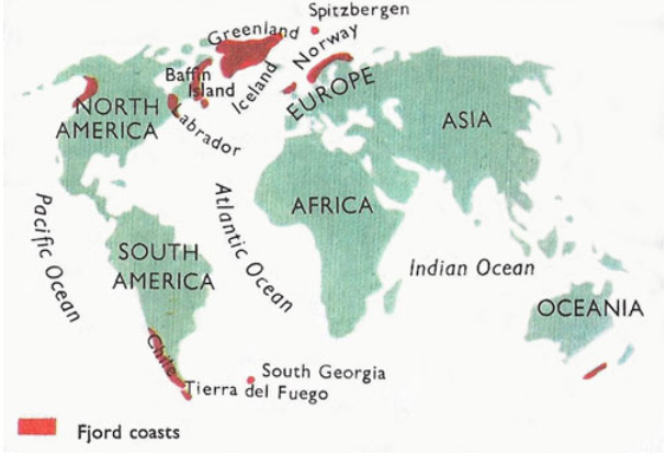 从上图可以看出,峡湾主要分布在高纬沿海地区:北半球主要有挪威、丹麦、冰岛、加拿大、阿拉斯加地区,而南半球为新西兰和智利南岸。这里第四纪入海冰川发育,之后气候变暖,冰川后退,海水入侵。