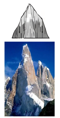 位于安第斯山脉中的巴塔哥尼亚冰原是世界第三大冰原,冰原上多花岗岩山峰,山体垂直方向的节理(岩石裂隙)发有。托雷峰海拔3128米,相对高度1227米,在最顶端有一个高达50米的冰川,它就像一座直插云霄的匕首,从任何一个角度攀登,其坡度都在80°以上(左图),是世界上攀登难度最大的山峰之一。右图示意塔状尖峰的发展示意图。