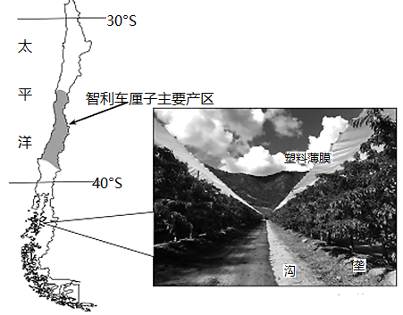车厘子喜光、喜温且不耐寒,要求土质疏松,排灌条件良好。智利中部独特的自然条件使车厘子品质很好。智利车厘子采用人工采摘,收获季是每年的11月到次年2月,从采摘、筛选、加工、冷链包装、最终运输到中国消费者手里,只需要72个小时,批发价格每箱(5公斤)人民币400-700元。“车厘子自由”已经成为近年来年轻人衡量自己收入水平的新标准。近年来,智利车厘子种植开始向南向北扩展,南部地区的农场主为了种车厘子还建造了“房顶”、采取塑料薄膜保护。下图为智利车厘子主产区分布示意图和智利南部车厘子种植景观图。