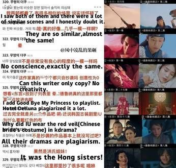 观众争议的点从剧情内容层面直接上升至国家文化层面的抄袭和融梗,虽然这种情况在韩国屡见不鲜,尤其是从iu领衔主演的的《德鲁纳酒店》就让观众见识到了洪氏姐妹融梗的能力,大量剧情和画面借鉴中国李木戈导演的古装剧《东宫》,相似度高度重合。