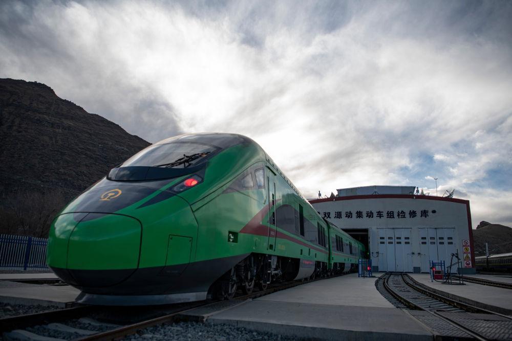 在拉萨机辆整备中心,动车组在检修库进行整备作业(1月10日摄)。