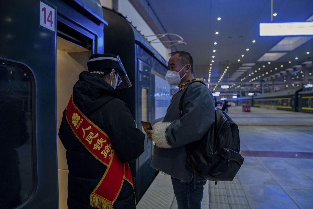 在拉萨火车站,黄起岗检票上车,准备回家(1月16日摄)。
