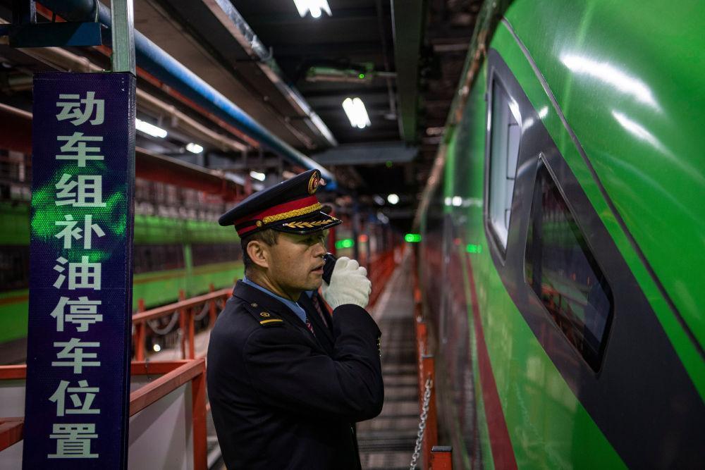 在拉萨机辆整备中心,黄起岗在和一体化调度中心确认动车组补油位置(1月11日摄)。