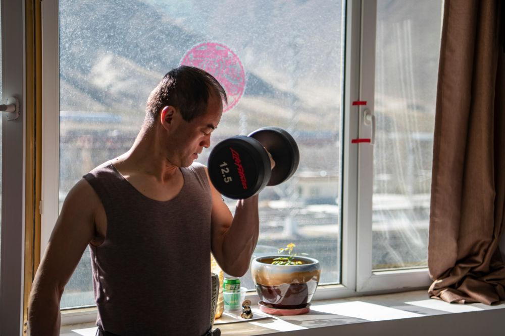 在拉萨机辆整备中心的宿舍里,黄起岗利用空闲时间锻炼身体(1月11日摄)。