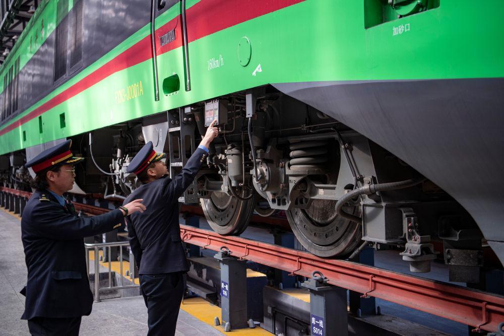 在拉萨机辆整备中心,黄起岗(右)和同事对动车组进行走行部检查(1月11日摄)。