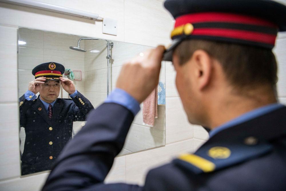 在拉萨机辆整备中心的宿舍里,黄起岗整理自己的着装(1月11日摄)。