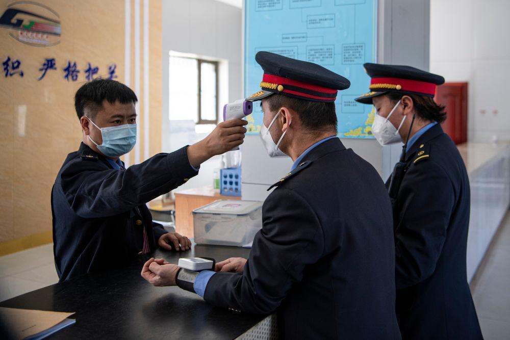 在拉萨机辆整备中心,黄起岗(中)在出勤前接受身体情况检测(1月11日摄)。