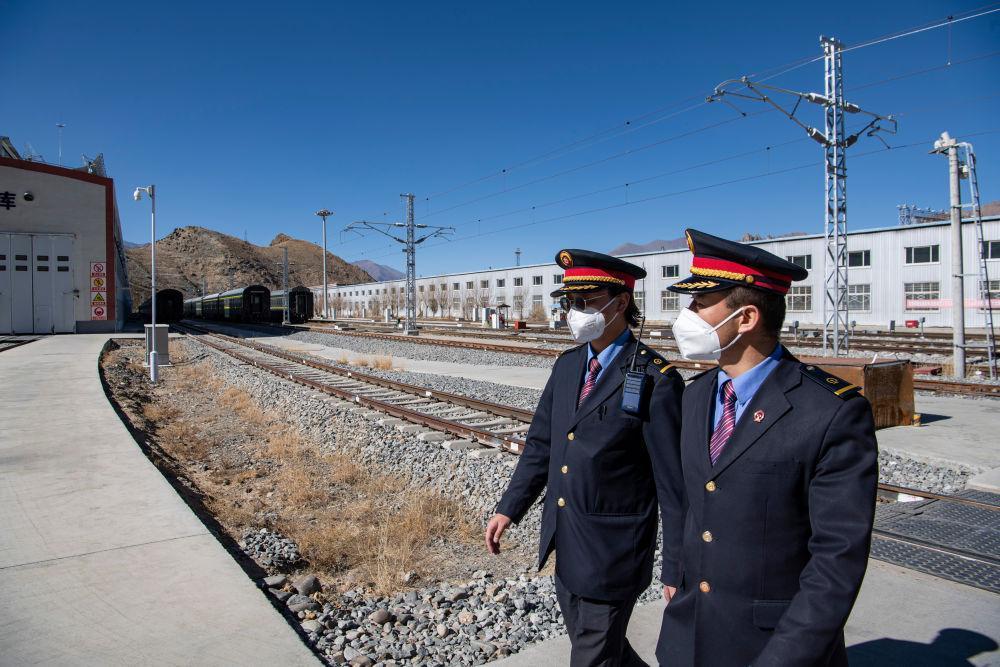 在拉萨机辆整备中心,黄起岗(右)和同事将动车组驶入停车位置(1月11日摄)。