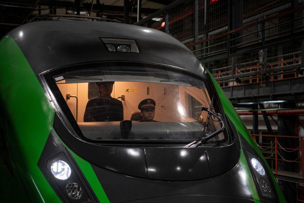 在拉萨机辆整备中心,黄起岗将动车组驶入停车位置(1月11日摄)。