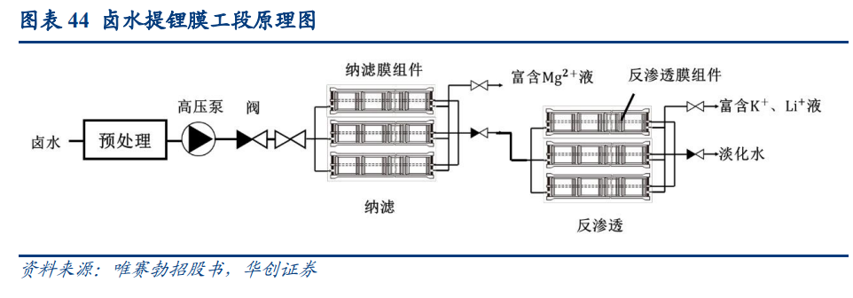 纳滤是一种压力驱动的膜分离过程,是卤水镁锂分离和杂质去除最关键的一步。特殊的 纳米级孔径和膜表面的荷电性,使其对二价、多价离子和其他有机物截留率较高(Mg2+、 SO4 2-等),但对单价离子(Li+、Na+、K+等)截留率较低(通常低于 30%)。基于以上特 点,纳滤膜分离技术特别适合中国高镁锂比盐湖卤水在低锂浓度下的镁锂分离需求。 纳滤的特点在于分离效率高、能量消耗低、操作过程简捷、设备集成化高。但由于在纳 滤过程中,截留侧二价及二价以上离子浓度逐渐增加,而膜两侧一价离子浓度接近,因 此纳滤膜两侧化学势相差较大,需要增加操作压力才可保证膜的产水量。但伴随更大的 操作压力,纳滤膜对二价及二价以上离子的截留效率下降,因此实际操作中,纳滤膜并 不能完全分离镁和锂,只能显著降低卤水中的镁锂比。这一缺陷使得纳滤膜更适宜于镁 锂比低于 30 的卤水;或需要在纳滤分离前稀释高镁锂比卤水。此外,卤水成分复杂, 直接处理会导致膜表面污染结构、膜组件堵塞等问题。因此,纳滤膜很少被单独应用在 盐湖提锂的工程化项目中,而是与反渗透、电渗析、吸附等技术结合形成耦合提锂技术。 纳滤膜的成膜材料与反渗透膜基本一致。商品化纳滤膜材料包括:醋酸纤维素(CA)、 磺化聚砜(SPS)、磺化聚醚砜(SPES)和聚乙烯醇(PVA)等。纳滤膜组件大多为卷 式组件,也有采用管式和中空纤维式的纳滤膜组件。
