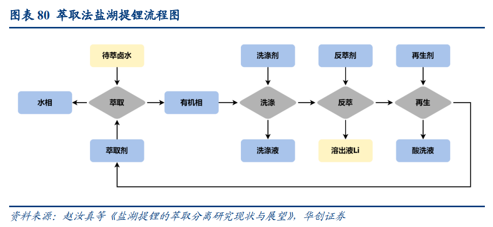 中科院过程工程所齐涛与朱兆武团队针对青海高镁锂比下的盐湖镁锂分离,首先开发出 了多组分协同溶剂萃取—水反萃清洁提锂新技术,锂收率大于 95%;该工艺解决了传统 萃取工艺中高酸反萃,乳化严重、萃取剂降解损失大、设备腐蚀严重等缺陷,通过协同 配位和氯离子浓度控制锂的萃取和反萃,并将 Fe3+固定在有机相,实现水反萃过程中 Li/Fe 分离:萃取有机相中无余酸,不需碱再生即可循环利用,大幅减少淡水消耗和废 液排放,显著降低运行成本;富锂溶液酸度低,生产碳酸锂产品步骤简单。