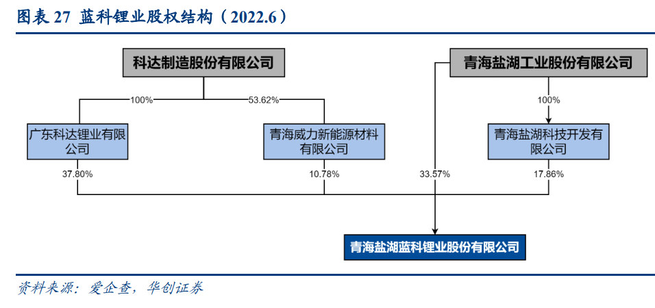 青海盐湖蓝科锂业股份有限公司系科达制造与盐湖股份的子公司,是国内最早使用“吸 附+膜法”工艺进行盐湖提锂的企业。蓝科锂业作为盐湖股份的子公司,主要实施对青 海察尔汗盐湖的开发;其技术起源于俄罗斯,经过十余年完善与打磨,察尔汗盐湖 3 万 吨提锂产能已实现满产。