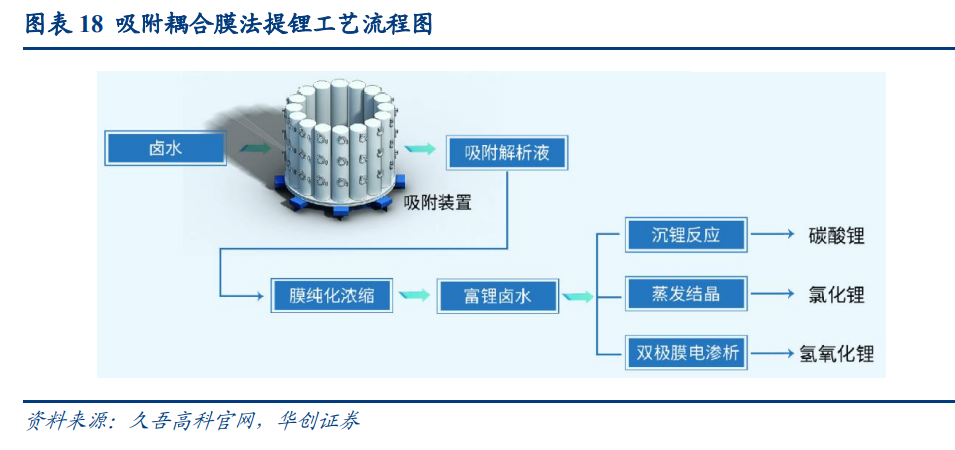 此前,在盐湖提锂的工业化过程中,吸附法和膜法分别作为单一的提锂方案进行测试。 但吸附剂存在吸附容量小、解吸液锂浓度低、杂质含量高等缺点,单独产线难以达产达 标。纯膜法的局限性则在于膜使用寿命较短,维护成本高,能耗较大;高盐度、高矿化 度的卤水也容易造成膜污染,频繁更换增加生产成本。 蓝科锂业通过与启迪清源合作,将吸附法技术与膜法结合,开创了吸附耦合膜的系统提 锂工艺路线,有效解决了单一吸附法、膜法生产过程中的问题。该方案经过蓝科锂业、 蓝晓科技等公司的持续优化,目前已成为国内青海地区盐湖提锂项目的最主流方案。 吸附+膜法优势:1)可以原卤直提或者从高镁锂比的盐湖卤水中提锂,降低原卤边际品 位,提高锂收率的同时大幅缩减盐田面积,缩短生产周期;2)使用全程用水解吸即可, 无需添加任何化学试剂。 吸附+膜法缺陷总结:1)成熟运用的铝系吸附剂吸附容量通常小于 5mg/g,低于理论吸 附容量;2)解吸和顶液过程需要消耗大量淡水资源,在淡水资源稀缺的盐湖矿区受限; 3)吸附剂存在形式为粉末状,制备和成型工艺影响较大,流动性和渗透性较差,生产 过程中易造成吸附剂的流失;4)吸附剂通用性差。