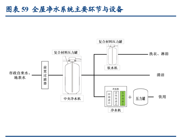 公司三大类产品功能来看,反渗透膜或纳滤膜元件、膜元件压力容器一般组合成膜组件, 在反渗透或纳滤环节中,实现脱盐功能,在家用、商用、工业领域均有使用。复合材料 压力罐可用于家用及商用领域中的净水和软水设备,其内部装载活性炭、离子交换树脂 等滤料,以实现水体的净化和软化;在市政及工业领域则内置石英砂、活性炭等滤料, 对原水进行初步过滤。