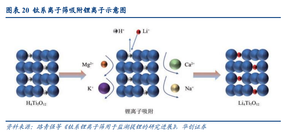 针对铝系吸附剂的缺陷,国内外又进行了新型吸附剂的研究;其中更具产业化应用前景 优势的是离子筛型钛系、锰系吸附剂。钛系、锰系离子筛是将锂源与二氧化钛、锰氧化 物等钛源、锰源混合,反应生成离子筛前驱体,采用酸将其中的 Li+洗脱出去可获得离 子筛,将离子筛放置于含锂卤水中吸附可再次形成锂钛、锂锰复合氧化物。钛系离子筛 对 Li+的理论吸附容量可达 39.8mg/g,造粒后容量为 3~5mg/g,与铝系相当,具有溶损 率较低、锂洗脱率高、性能稳定的优点,且弥补了锰系溶损率高的问题。锰系离子筛在 脱锂剂的作用下可将结构中的锂离子几乎全部脱除,因此具有更高的吸附容量,对 Li+ 的最大理论吸附容量最高可达 82.3mg/g。 此外,铝系吸附剂通常更适用于中性卤水(不耐酸不耐碱),锰系吸附剂适用于中性偏 酸性卤水(最高 7.5-8,耐酸不耐碱),钛系吸附剂适用于碳酸盐型盐湖卤水及强碱性液 态矿产(耐酸碱)。