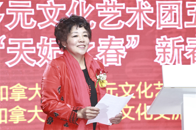天妃多元文化理事会会长,加拿大中华妈祖文化交流协会副会长兼理事长蔡荔梅女士首先向所有的来宾拜年并致辞。