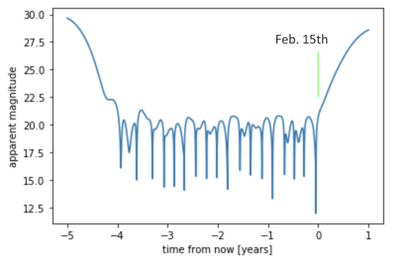 2月15日被发现的时候,它与地球相距大约30万千米,稍近于地月距离,视亮度20等。