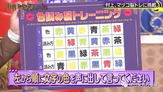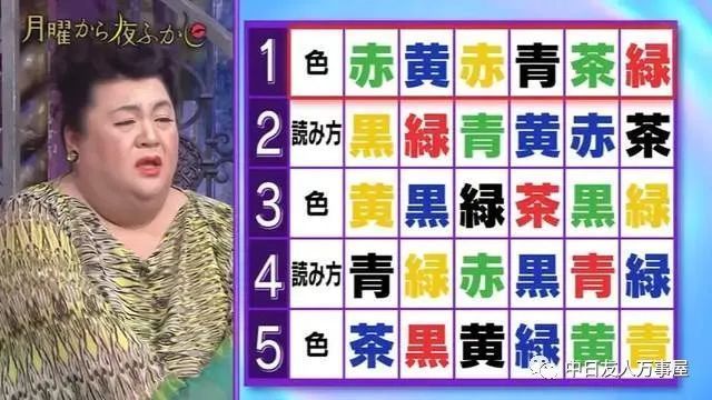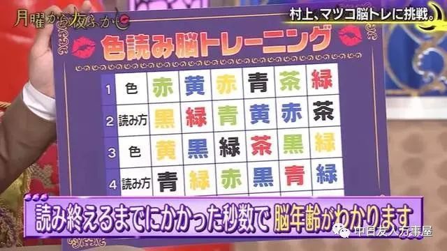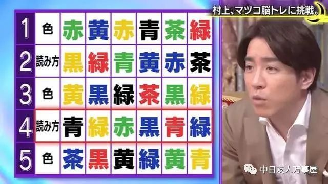 「脑年龄测试」这次的游戏规则是这样的,从左到右按照顺序读出颜色,难点就在于五行里面颜色跟念法的配色未必一样,所以当眼睛看到吸收到大脑再讲出来,这就考验到每个人大脑处理器的处理效能了