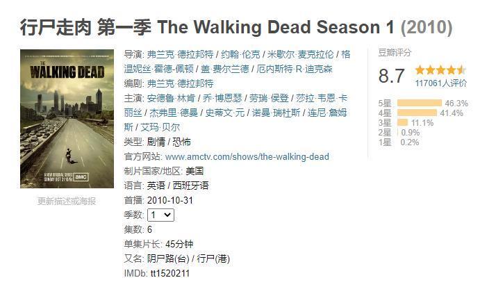 关于判断一部作品在国内“火不火”我有一个小方法,就是看它在豆瓣上的评分人数,如果是跨越多季的电视剧,那么其第一季的评分人数最有参考价值,《行尸走肉》目前是11.7万+。