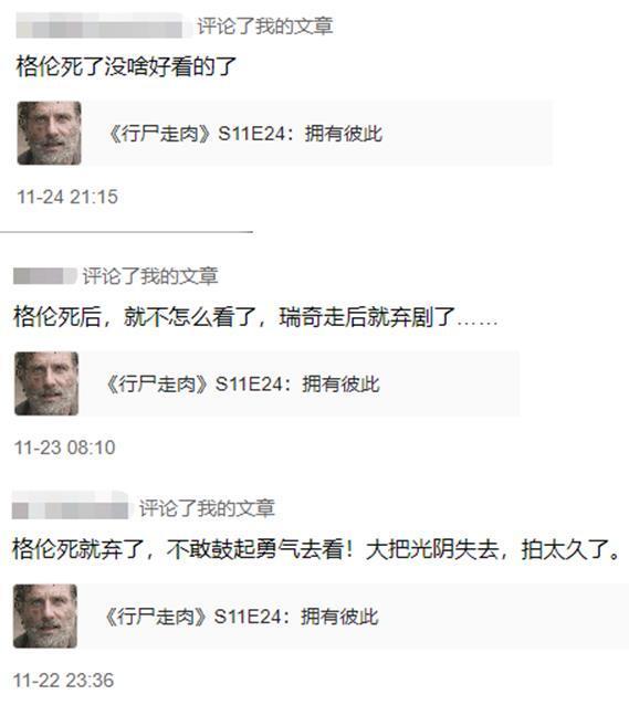 另外,我还不得不小小吐槽感慨一番,这六年多来写《行尸走肉》剧评的经历,也帮助我好好磨炼了心境——因为总是有人在我的文章下面留言表达自己弃剧,其中又以“格伦死后我就不看了”最多。