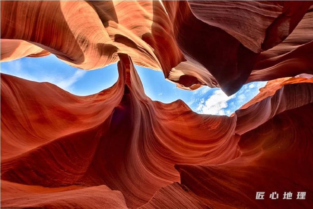 羚羊峡谷的岩性为砂岩,千万年来,受到暴洪流和风力的不断侵蚀,形成了坚硬光滑、如同流水般的岩壁。
