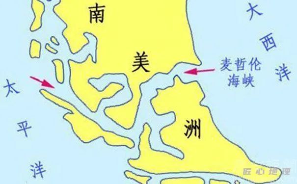 麦哲伦海峡位于南美大陆和火地岛之间,全长592千米,宽窄悬殊,深浅差别也很大。最宽的地方有33千米,最狭处仅3千米左右;最深处在千米以上,最浅的地方只有20米。西段呈西北—东南走向,中段南北走向,东段又从西南折向东北,自西至东,拐了一个直角弯。中、西段的海岸也很曲折。两岸陡壁耸立,海岬、岛屿密布。
