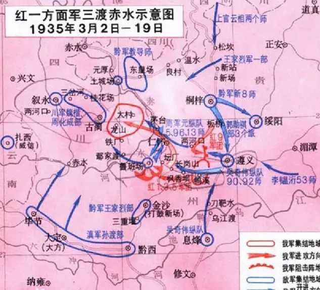 命令大量国民党军涌入四川云南两地,将红军团团包围起来,教员早就料断老蒋一定会屯兵川南,造成黔北地区严重空虚,这正是红军挥师黔北的好时机。