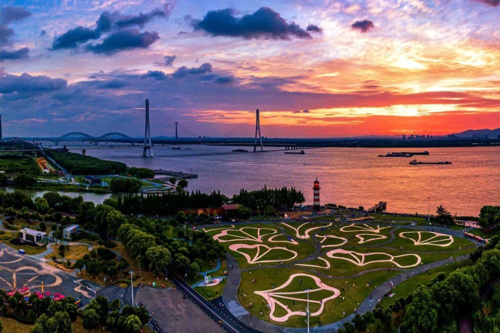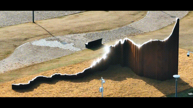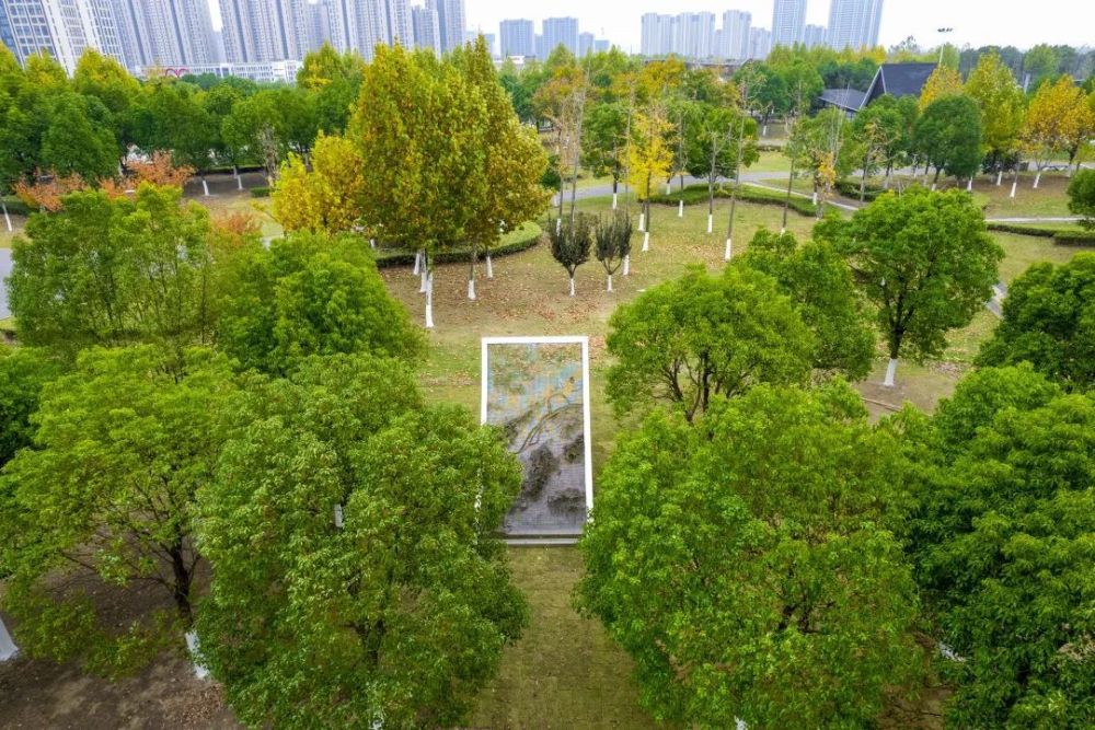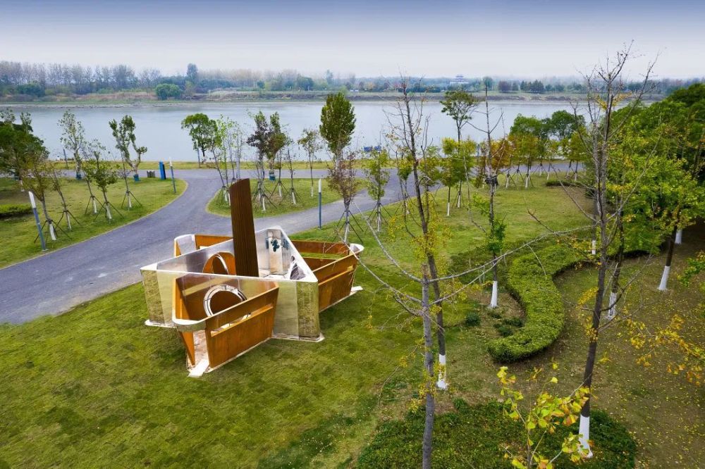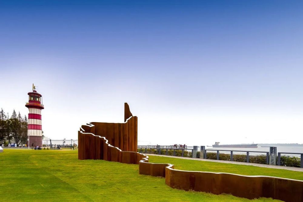 《江山》,用雕塑语言重塑长江流动轨迹及阶梯剖面,作品反射效果如流动的江水,其阶梯剖面形似山川,与灯塔相映,大气磅礴。