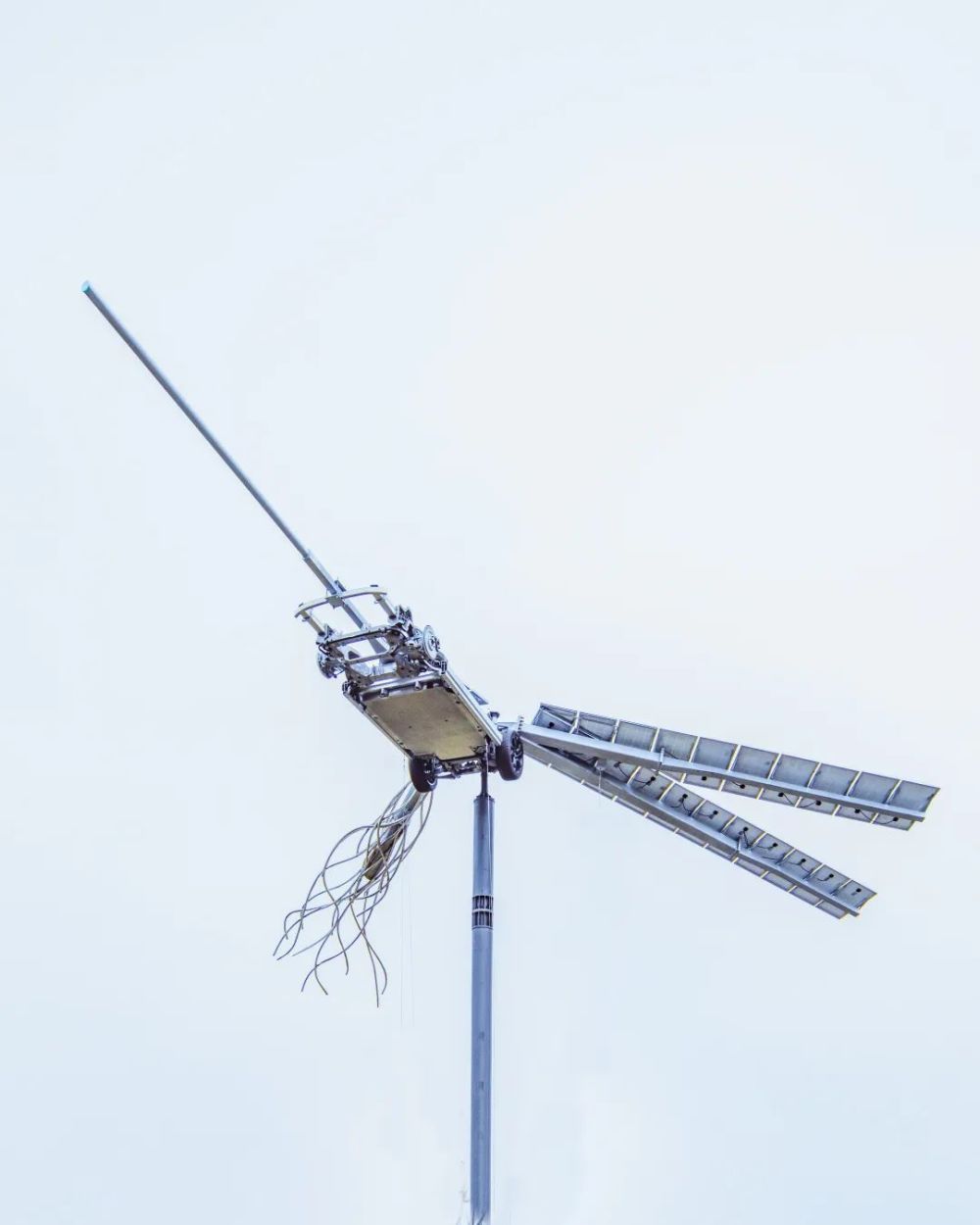 《红色的蜻蜓》融入科学元素,由太阳能板构成蜻蜓的一边翅膀为另外一边翅膀提供发光的电能,整个作品可随风作360度的旋转,生动有趣。