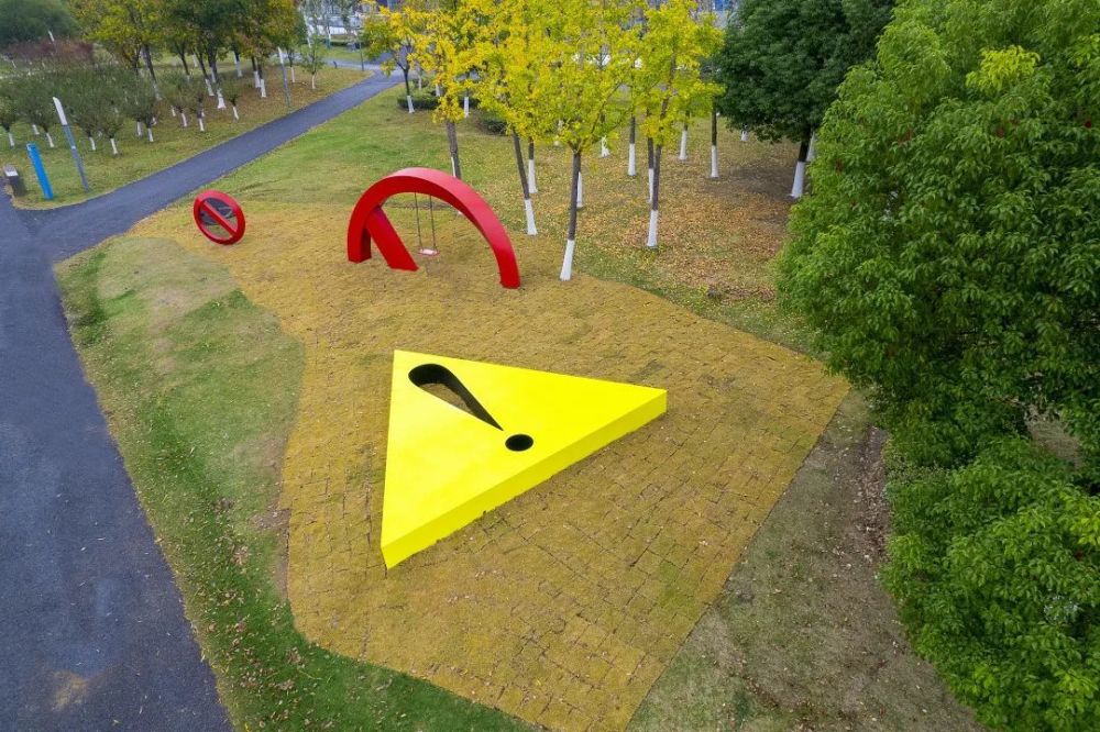 《江畔虹影》中间为可旋转的镜面,当观众站在作品前会变为符号的一部分,环境的映入和观众的参与增强了互动的趣味性。