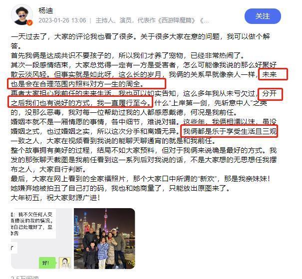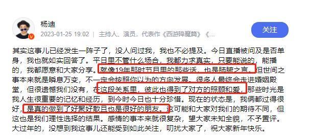 尽管杨迪专门发文表示,两人是好聚好散。