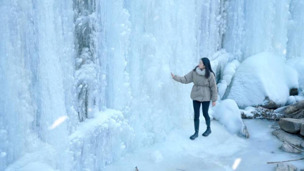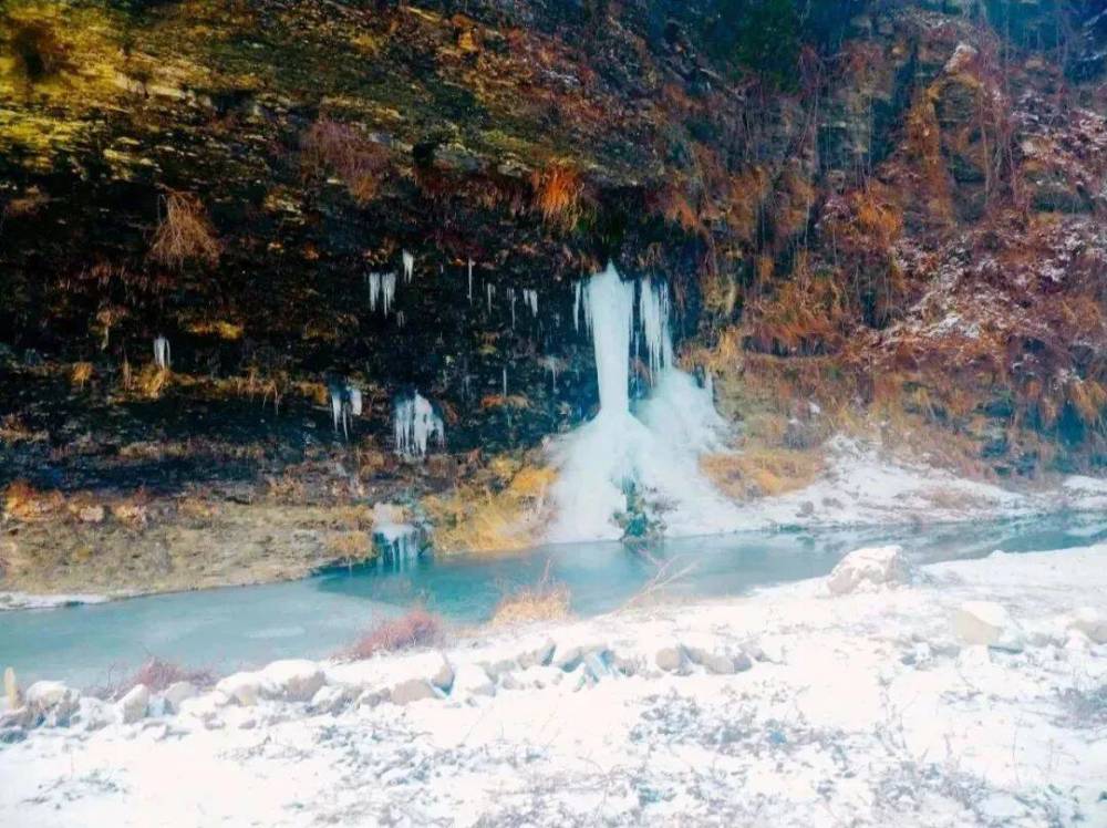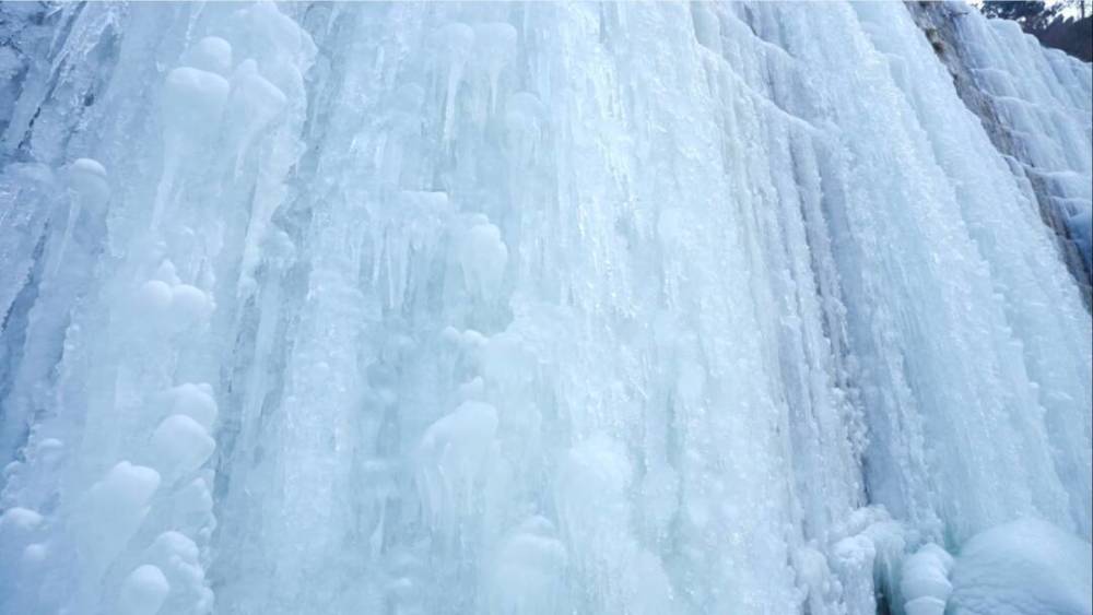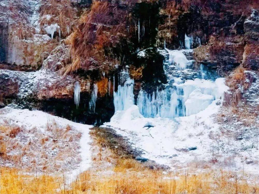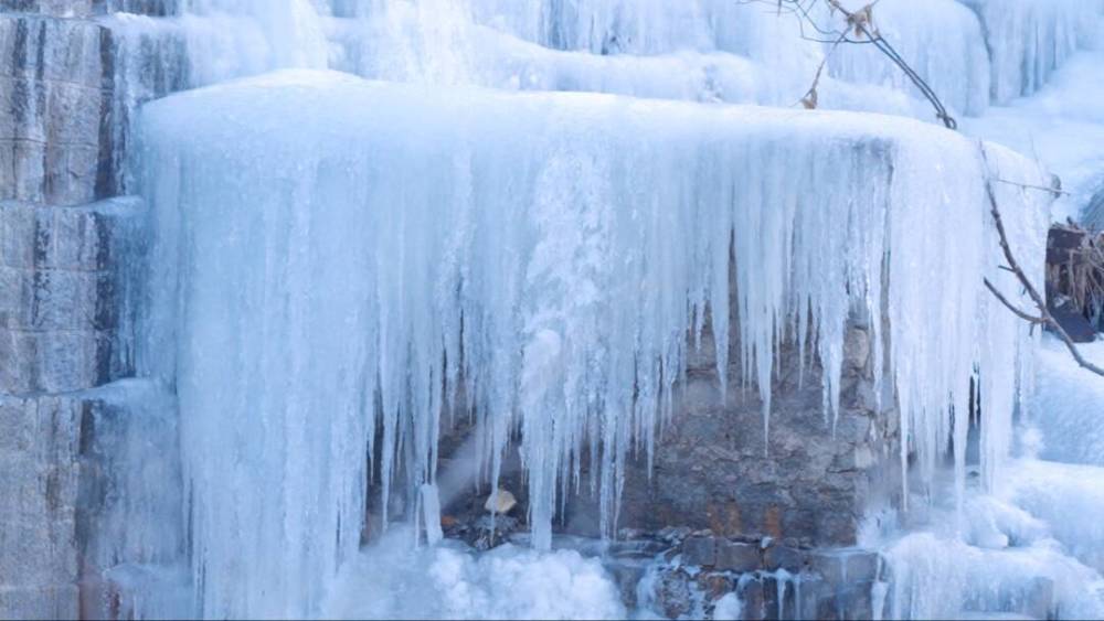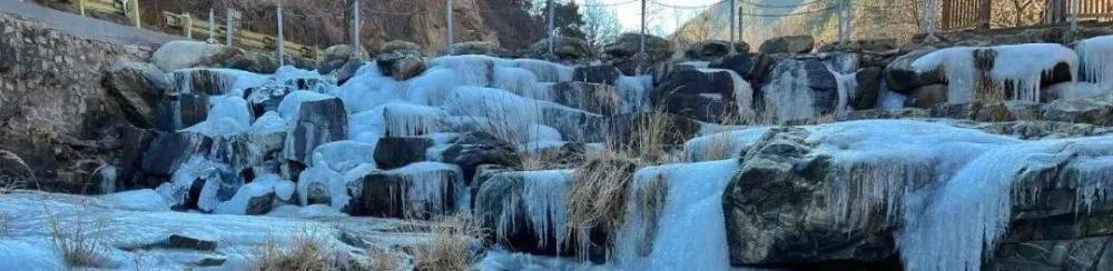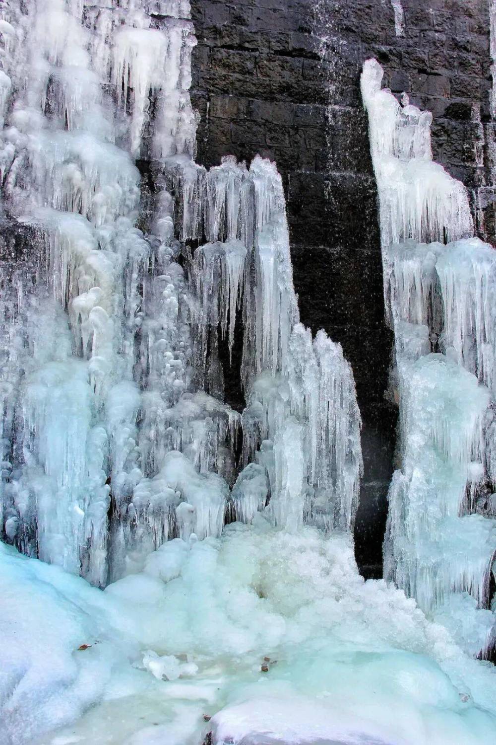 草木石崖裹着天然琉璃,山壁被晶莹剔透的冰挂覆盖,水花飞溅的躁动被定格在山坳之中,连水坝旁边的阶梯也如冰雕玉砌一般,不禁让人惊叹大自然的鬼斧神工。
