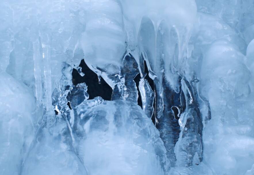 琼妆玉砌,冰川倒挂。大坝上层层叠叠的冰笋冰凌不断累积,将瀑布一泻千里的姿态定格,却又保留住了它雷霆万钧的气势。