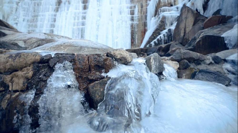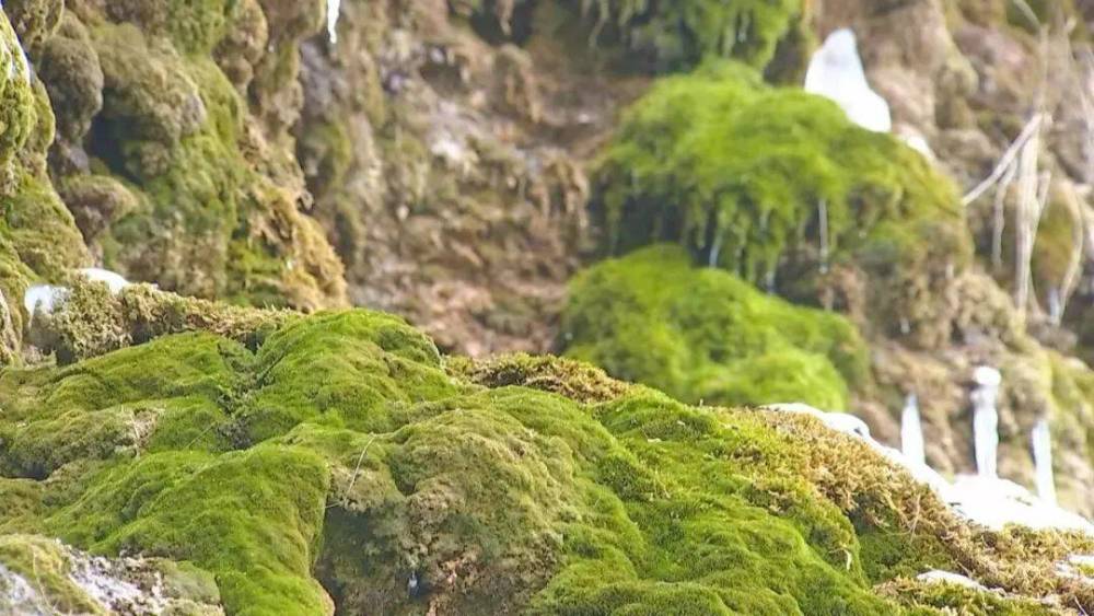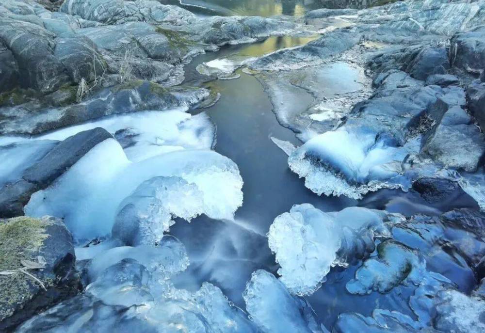 冰层之下流淌的溪水泛起阵阵微波,在阳光的照耀下熠熠生辉。宁静的幽谷中忽闻流水叮咚,让人恍惚间宛若置身梦幻仙境。