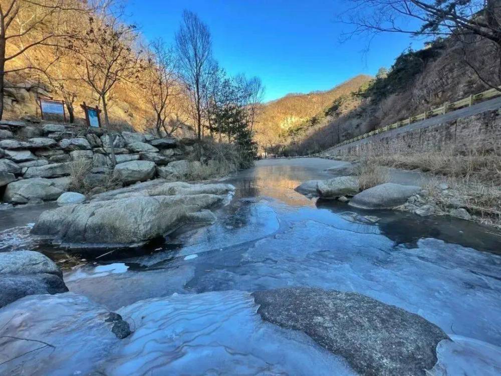 彩石溪自然景观秀美奇绝,十里山涧彩石铺就,如同散落山间的飘带。冬日里气温降低,潺潺流水变成了层层冰瀑,形态各异,玲珑剔透,在阳光下变幻出奇妙的光泽。