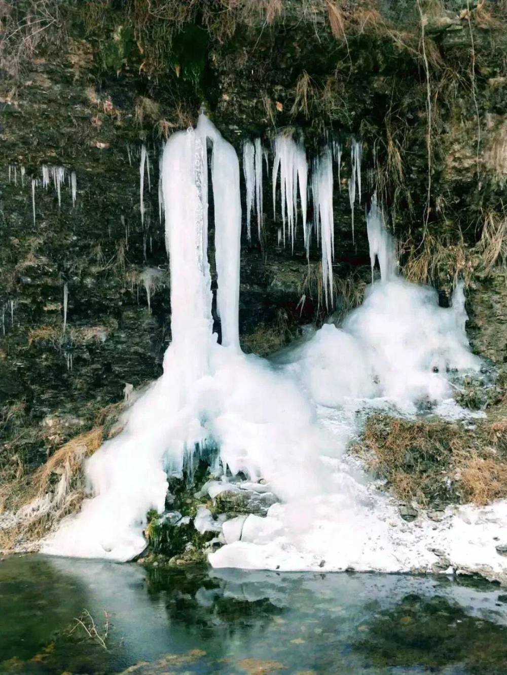 远观滴水崖冰瀑,从崖顶到崖脚,满是千姿百态的冰柱、冰块,时而分散,时而聚集,似龙须、似玉带……近看端详,水流在山脚堆积,如同积云。