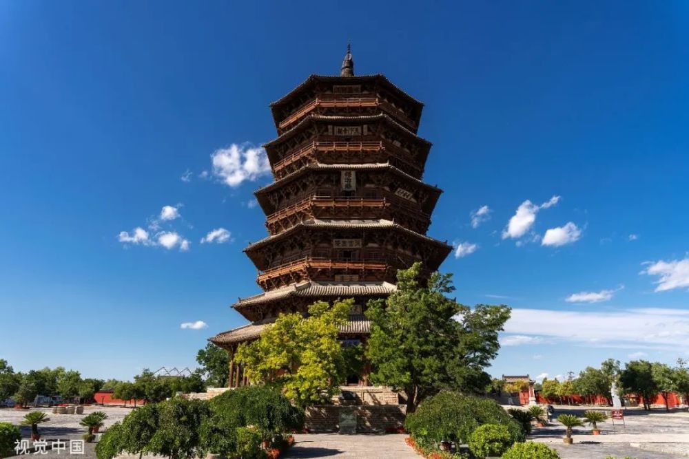 山西应县佛宫寺释迦塔,建造于公元1056年,是古代应州城的标志性建筑。塔身为楼阁式建筑,平面八角形,五层六檐,全塔皆由木构件搭建而成,屹立千年岿然不动,是现存最高的全木结构高层塔式建筑,堪称木构建筑的奇迹。