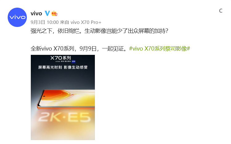 当然,除了影像体验之外,此次vivo X70系列在其它方面也非常出色。从@vivo官微在微博上公布的信息来看,该系列搭载的屏幕也极具有看点,它将搭载2K超清分辨率+E5显示发光材料,能够还原所拍照片中的真实色彩。日常使用时,随时随地都能感受到出色的画面效果。